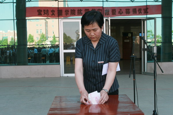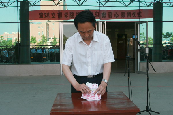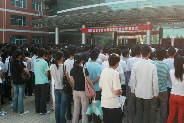 全体机关工作人员、离退休人员参加了募捐仪式。中文系、地环系和物理系、机电系的学生分别代表全院学生参加了募捐仪式。