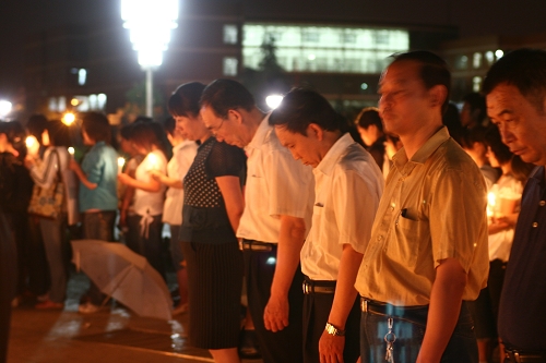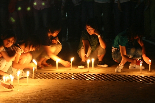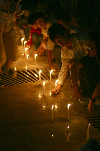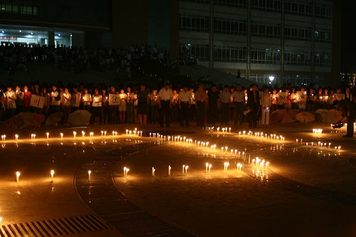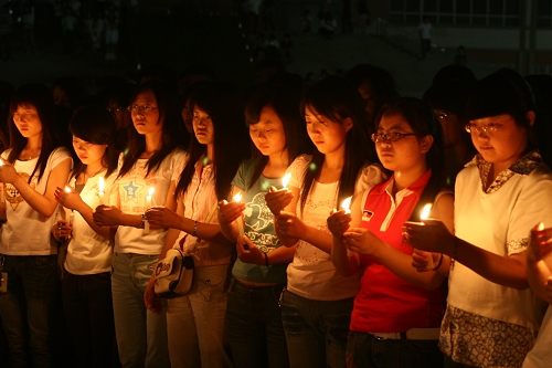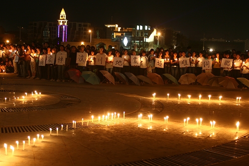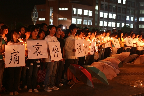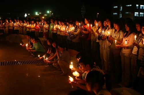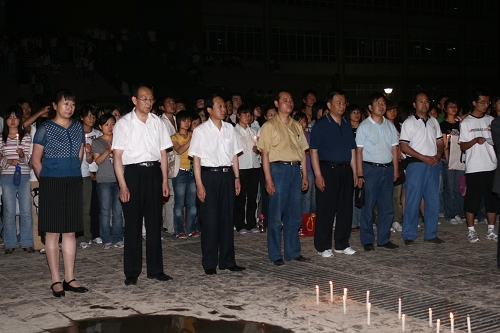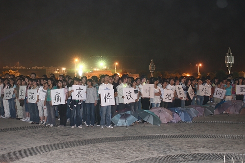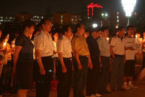 外语系学生手捧百余支蜡烛,围成心形,并在其中用600支蜡烛围出“5·12”字样,他们手持“外语系全体师生沉痛悼念汶川地震遇难同胞”、“汶川挺住,中国加油”的标语牌,整个活动场面庄严、肃穆。