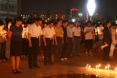 5月19日晚,外语系全体师生在新校区广场举行烛光悼念活动,沉痛悼念汶川地震中的遇难同胞。院长王志刚、党委副书记李全武、院长办公室主任贾卫忠、学生处副处长唐晓育、团委书记冯森及外语系党政领导出席了此次活动。悼念活动由外语系主任党明虎老师主持。