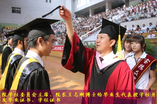 毕业典礼在雄壮的国歌声中正式开始。院党委书记赵怀礼给西部志愿者学生和赴藏工作学生颁发了奖金;学位委员会主席、院长王志刚博士向毕业生代表颁发了毕业证书和学位证书;院党委副书记米晓东宣读了获优秀毕业论文、毕业设计、毕业创作名单;教务处长杨子元宣读了2008届学生毕业资格审查结果和学士学位授予结果;学生处处长李建民宣布西部志愿者学生名单和赴藏工作学生名单。