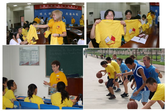 夏令营活动期间,所有营员被分为两组:文化交流组和体育交流组。每组都安排了中美师生一对一的交流活动。中美大学生在轻松、愉快的环境中进行对话、表演、游戏、音乐欣赏,取得了很好的效果。体育交流组将基本功训练、小组竞技、友谊比赛等结合在运动中以加深中美学生之间的了解,在娱乐中增进友谊。夏令营结束时,中美大学生共同举办了一场才艺展示大会,每一位参加夏令营的中美师生都分别展示了各自的才艺,歌曲、小品、舞蹈、绘画、书法、模仿秀等精彩纷呈的活动将整个夏令营才艺表演推向高潮。