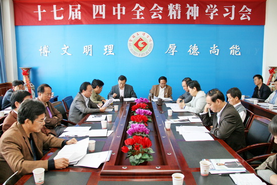 院长王志刚结合全会精神的学习,重点就高校如何在新形势下加强和改进党的建设,指出应该做到“五个必须”:一是必须充分认识、深刻理解在新的历史条件下加强和改进党的建设的必要性和重要性;二是必须从高校自身所承担的职责和使命的高度来认识加强和改进党的建设;三是必须从建设学习型政党的高度、从加强学校各级党组织自身建设、干部队伍建设、党员思想建设,不断提高党组织的战斗力来认识加强和改进党的建设;四是必须从促进学院科学发展、和谐发展、实现“十一五”奋斗目标、跨越式发展的高度来认识加强和改进党的建设;五是必须把学习、贯彻落实四中全会精神同学习实践科学发展观活动整改落实工作、提高教育教学质量长效机制、推进“硕士学位授予权立项建设高校”、大学文化建设、维护稳定等工作紧密结合。
