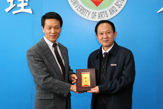 王志刚首先代表学院对井上佳久教授和刘育教授来院讲学并受聘为客座和特聘教授表示欢迎!他从学院历史、教师队伍、学科建设、区位优势、管理规范、人才质量较好、获教育部本科教学工作评估优秀和发展中的大学等八个方面为客人简要的介绍了我院基本情况。他说,学院正值全面启动实施授权学科、支撑学科建设的关键时刻,随着井上佳久教授和刘育教授的受聘,我院化学学科会更上一个层次。同时,能邀请井上佳久教授和刘育教授来我院指导学科建设工作,也是我们作为西部高校的荣幸。相信有井上佳久教授和刘育教授的指导,化学学科在学科建设、科研和教学方面会有更好的发展。随后,院长王志刚向井上佳久教授和刘育教授教授颁发了聘书。