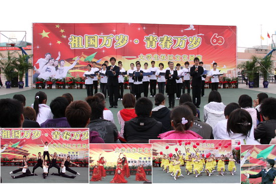 由院团委、后勤集团、后勤公司联合主办的我院2009年“祖国万岁·青春万岁”大学生社区文艺展演活动于10月15日和16日分别在新老校区篮球场举行。院党委副书记米晓东及相关部门领导与新老校区4000多名大学生一起观看了演出。院团委书记冯森致辞。