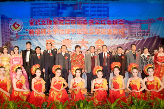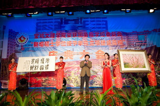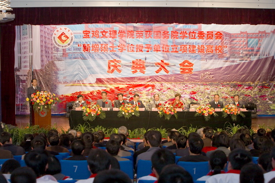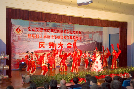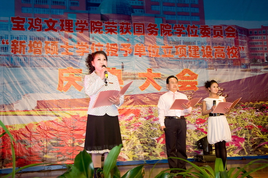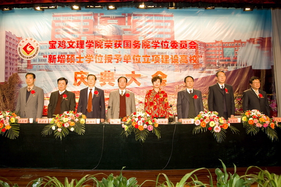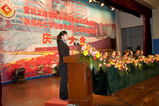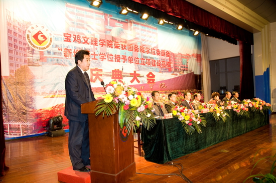 锣鼓阵阵,彩旗飘飘,鞭炮齐鸣,全院师生员工无不欢欣鼓舞,校园洋溢着一派欢乐、祥和、喜悦的氛围。4月15日下午,学院在新校区音乐厅隆重召开荣获国务院学位委员会新增硕士学位授予单位立项建设高校庆典大会。陕西省学位委员会秘书长、省学位办孙朝主任,宝鸡市人民政府副市长刘桂芳以及院党委书记赵怀礼,院长王志刚,党委副书记米晓东、李全武,副院长傅志军、王普藩、赵荣侠出席了会议。庆典大会由赵荣侠主持。