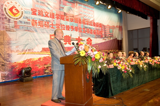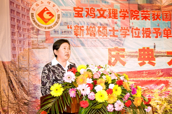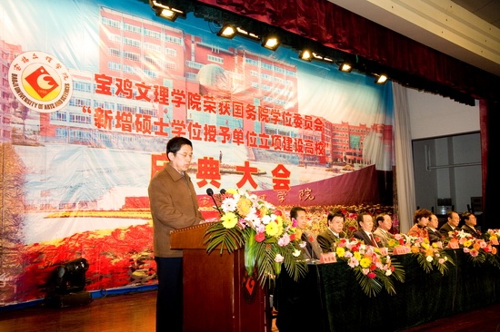 陕西省学位委员会秘书长、省学位办孙朝主任和宝鸡市人民政府刘桂芳副市长发表了热情洋溢的讲话。孙主任首先代表省学位委员会、省教育厅、省学位办向allwincity万象城官方网站表示热烈的祝贺和诚挚的慰问。他说,allwincity万象城官方网站今天获得这一殊荣,凝结着几代文理人艰辛的探索、孜孜不倦的追求与竭尽全力付出的心血与汗水,确属来之不易! “十五”开始,学院启动了申硕工作,加大了学科建设力度,进一步凝炼学科方向,优化学科队伍,夯实学科平台,活跃学术交流,构建了学科建设工作新机制,校地合作亦明显加强,学科实力和水平显著提升。这些显著成绩的取得无疑为成功获批为国务院学位委员会“新增硕士学位授予单位立项建设高校”奠定了坚实的基础,也为学院跨越式发展创造了条件。孙主任对新增硕士学位授予单位立项建设工作提出了要求与希望:第一,要高度重视,全力以赴。第二,要加大学科建设力度,快速推进立项建设各项工作。第三,要不辱使命,保证高质量、高水平完成立项建设的各项任务,顺利通过检查验收,获得硕士学位授予权并开展研究生教育,为地方经济建设和社会发展做出更大贡献。