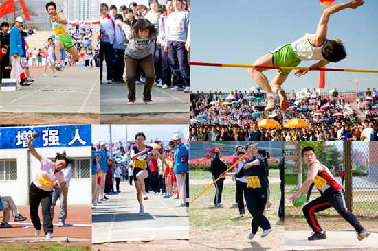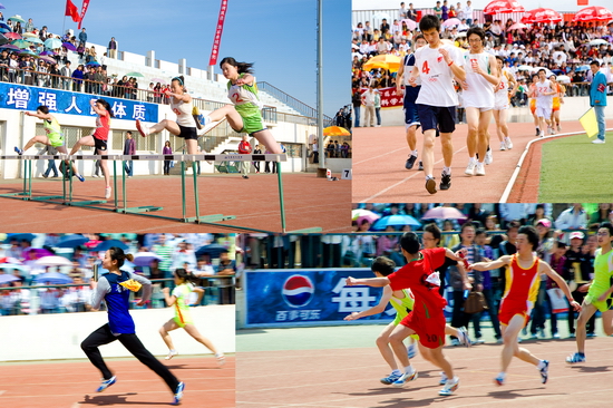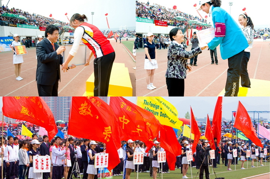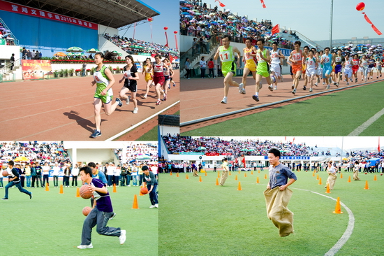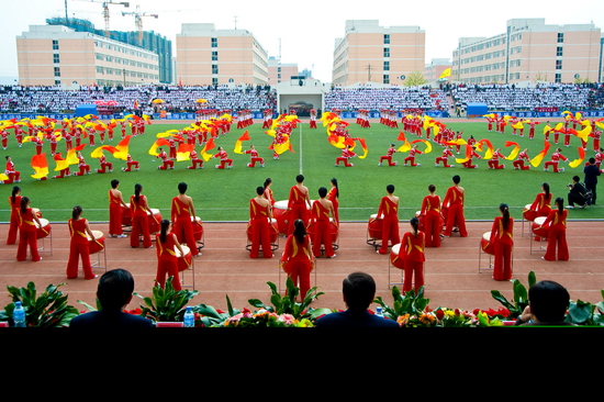 在开幕式和闭幕式上,我院大学生大型歌舞表演《青春节拍》、团体操表演《绽放2010》、《鼓扇如火》和学生的歌唱表演为运动会增添了靓丽的色彩。