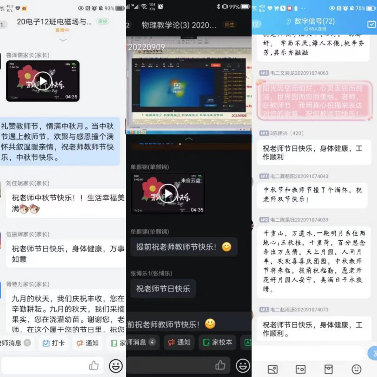 活动中,学院在全体学生中广泛征集大家对学院老师祝福的视频并精心剪辑。9月9日当天,同学们在线上课堂将祝福以视频形式送给老师,并在上课期间给老师们留言祝福。同学们也通过短信、微信等形式将各自的祝福送给辅导员、班主任老师。