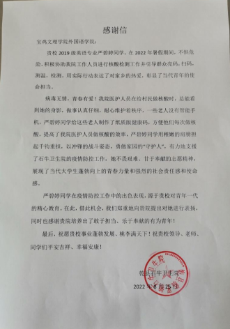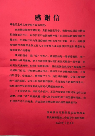 病毒无情,青春有爱。近日,外国语学院党委收到两封分别来自宝鸡市眉县汤峪镇疫情防控部门和咸阳市乾县石牛卫生院寄来的感谢信。在感谢信中,两个单位对万象城外国语学院2019级英语3班汤佳琪同学和2019级英语2班严碧婷同学积极参与当地疫情防控工作给予高度赞扬,感谢学校培养出敢于担当、乐于奉献的有为青年!