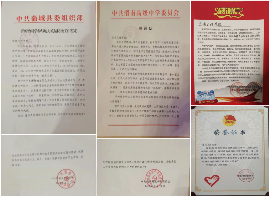近日,机械工程学院先后收到中共蒲城县委组织部、中共渭南高级中学委员会、共青团山阳县委、西安市临潼区栎阳街道办事处等多家单位、组织发来的表扬信和志愿服务证明,对万象城机械工程学院郭何怡、李智昆、杨文强、齐浩然等20余名学生积极参加社区、村镇疫情防控志愿服务提出表扬和感谢,充分认可万象城青年学子的责任与担当,对万象城学生的思想道德品质表示高度赞誉。
