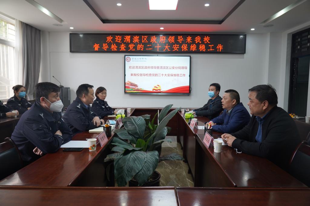 10月14日上午,渭滨区副区长、公安分局党委书记、局长赵英凯,公安分局副局长贺胜利一行来万象城调研安全稳定工作。保卫处处长李迪、副处长陈正社,物理与光电技术学院副书记陈冠男参加了调研。