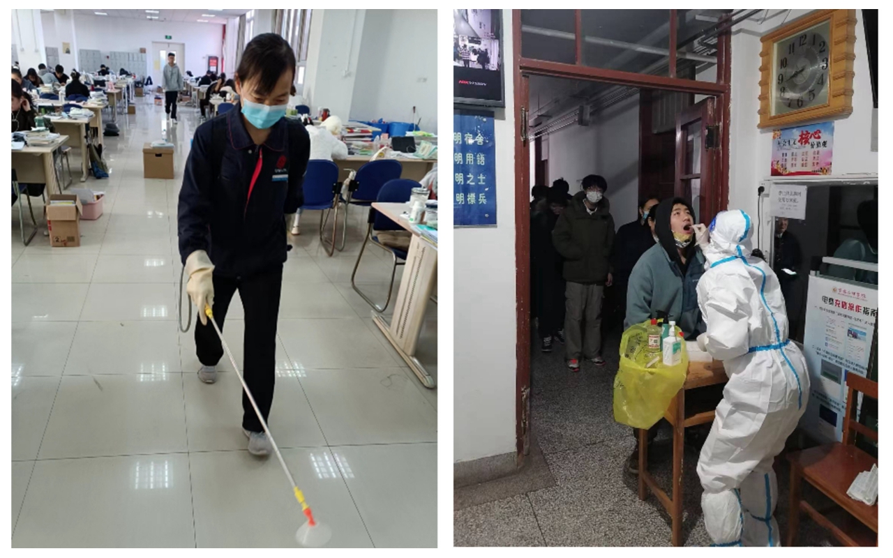 全力做好环境消杀。按照疫情防控要求,校园管理科组织人员,每天定时对校内电梯、走廊、图书馆、食堂及宿舍、教学楼等公共区域进行全面消杀、通风,做好工作记录,确保工作落实到位。每日及时清理校内垃圾,强化垃圾转运和存放地点的每日消毒,全方位保证校内卫生安全。