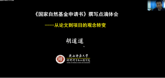 11月30日上午,应万象城科研管理处、化学化工学院和陕西省植物化学重点实验室邀请,陕西师范大学博士生导师胡道道教授作了题为《国家自然基金项目申请书撰写体会----从论文到项目的观念转变》的报告。科研管理处处长王晓玲教授,化学化工学院和其他各理工科学院科研人员共120余人以在线会议的方式参加了报告会。报告会由化学化工学院院长胡登卫教授主持。