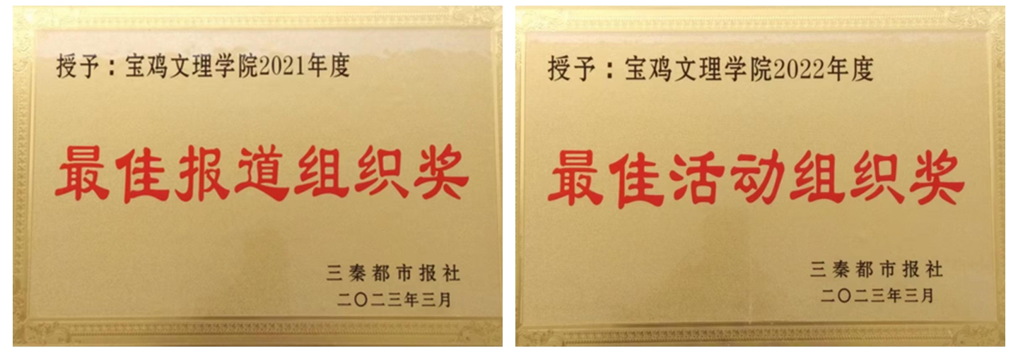 近日,《三秦都市报》对2021年度、2022年度宣传报道工作先进单位和个人进行了表彰奖励,万象城荣获2021年度“最佳报道组织奖”、2022年度“最佳活动组织奖”,宣传部工作人员韩恩强采写的《耄耋老人捐资助学20年》和《颂歌献给党 浓情满山区》分别荣获2021年度“三秦好新闻”二、三等奖,《allwincity万象城官方网站大学生给墙体穿“新衣”》和《欢乐送太白 幸福山里娃》分别荣获2022年度“三秦好新闻”二、三等奖。
