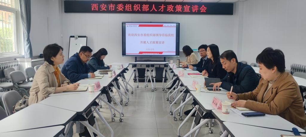 4月11日上午,西安市委组织部党员教育中心主任赵轩一行3人来万象城开展人才政策宣讲活动。会议由招生就业处处长范英主持。