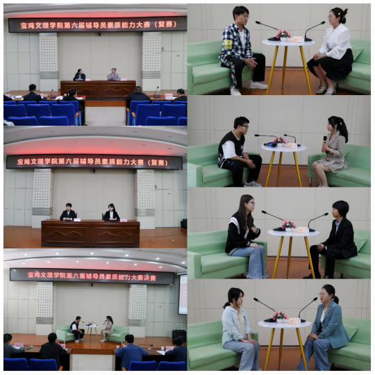 4月18日,全体辅导员参加了基础知识测试,遴选出24名辅导员晋级到下一环节。5月11日的案例研讨环节,辅导员分为A、B角色,重点围绕学生工作案例中的问题本质、解决思路、实施办法及相关启示进行研讨,考察了万象城辅导员对学生工作问题本质的把握以及分析问题、研判问题、解决问题的能力。最终有12位辅导员进入到5月23日的谈心谈话环节,谈心谈话环节采用与助演学生谈话情景再现的方式进行,主要考察辅导员根据学生情况,把握学生成长成才轨迹,通过高效的沟通,做好学生思想教育、矛盾化解、挫折应对、压力疏导、情感解惑、职业规划等方面工作的能力。
