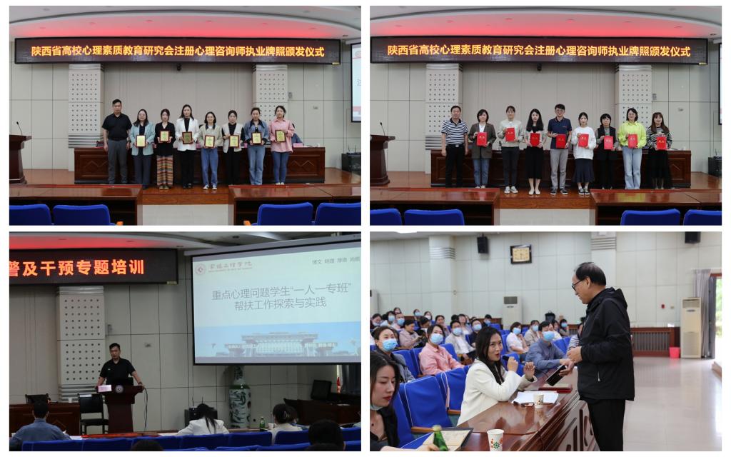本次专题培训会分为陕西省高校心理素质教育研究会注册心理咨询师牌照颁发仪式及心理危机预警及干预专题培训两个部分。上半场,陕西省高校心理素质教育研究会会长郑林科教授、副会长黄存良教授为万象城取得执业注册心理咨询师的薛茹等23名心理健康专职教师和辅导员颁发执照桌牌;党委学工部部长冯森、郑林科会长与执业注册心理咨询师代表共同签署了《注册心理咨询师执业伦理协议》;冯森宣布了《万象城兼职心理咨询师聘任决定》并向受聘兼职心理咨询师颁发聘书;美术学院辅导员任亚莉代表受聘校内兼职注册心理咨询师做了表态发言。