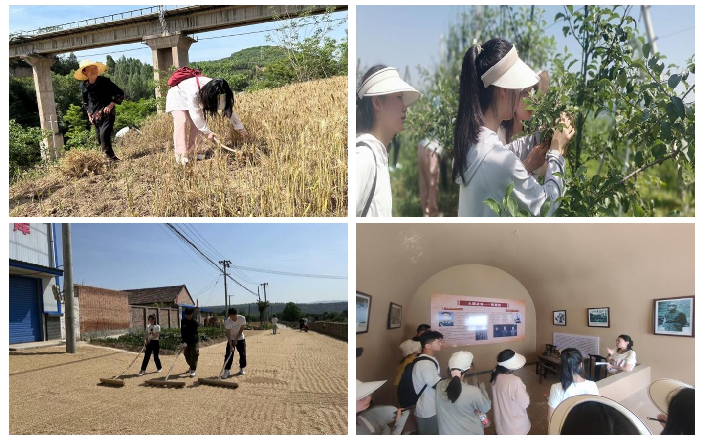 在千阳县水沟镇纸坊沟村,万象城驻村干部李道元老师分别从纸坊沟村的基本情况、新农村发展现状和特色产业助力乡村振兴工作等方面向同学们作了详细的介绍。同学们在村干部和村民的指导下体验了收割麦子、翻晒麦子、果园除草、苹果套袋等农事活动。
