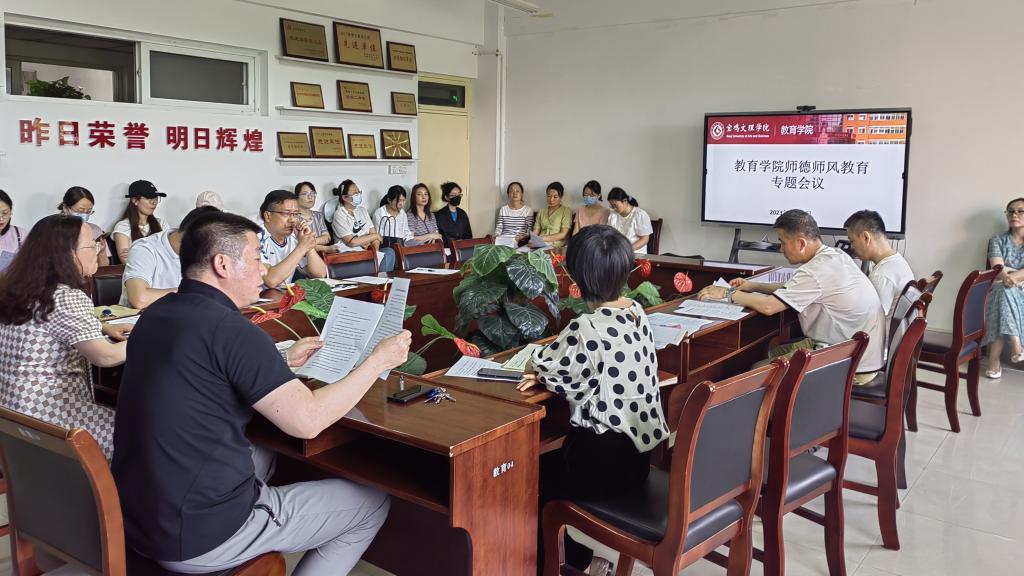教育学院党委书记白晓旭领学了万象城师德师风建设相关文件,并通报了近期教育部、陕西省教育厅公开曝光的违反教师职业行为十项准则典型案例。
