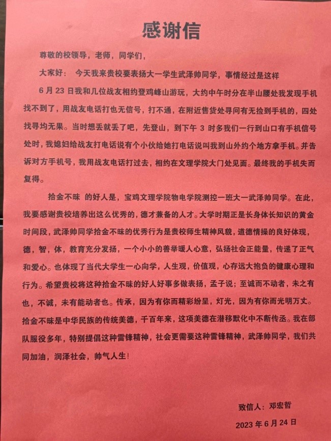 6月25日,宝鸡市退役军人邓宏哲致信万象城,信中表扬了万象城物理与光电技术学院2022级测控技术与仪器一班学生武泽帅,并对万象城培养出拾金不昧的优秀学生致以崇高的敬意和衷心的感谢。