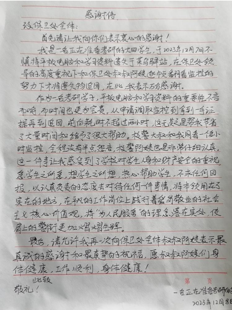 学生的感谢信是对保卫处工作的肯定,激励和鞭策保卫处工作人员继续秉承“不忘初心、全心全意服务师生”的宗旨,为建设平安和谐校园贡献力量。(保卫处 文/周文斌 审核/李迪)