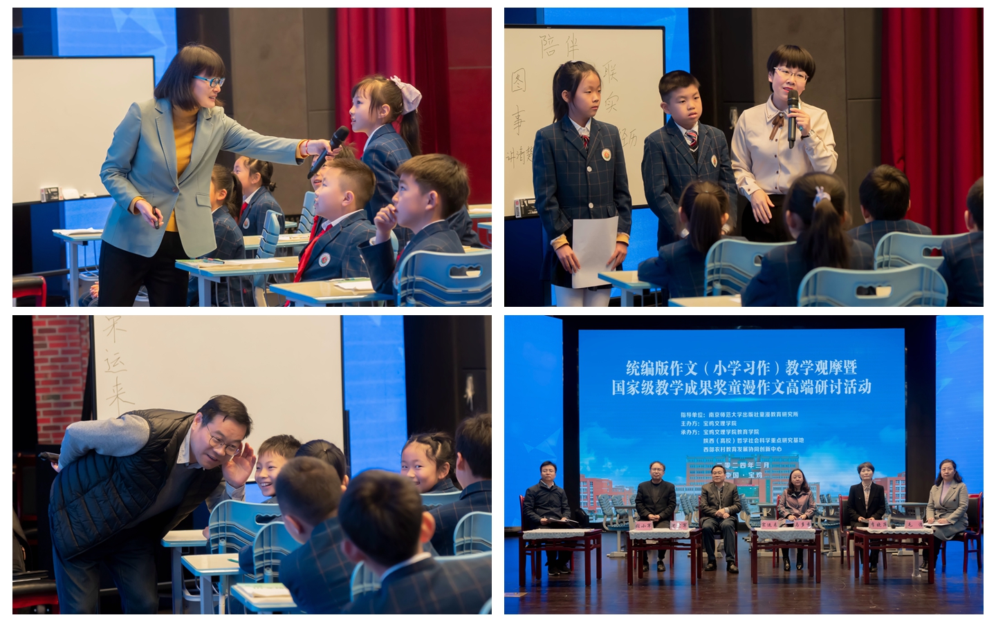 江苏省特级教师费洁、全国著名特级教师宋运来分别讲授了题为《意外的收获》《身边那些有特点的人》的示范作文课。陕西省教学能手、宝鸡市经二路小学教师张苗力开展研究课《陪伴》。千阳县教研室教研员张勇杰、眉县教育研究发展中心教研员兰宏伟分别对示范课和研究课作了点评。上海师范大学吴忠豪教授、宋运来分别作了题为《小学生作文的问题与应对》《如何让儿童产生持久的写作动力》的讲座。
