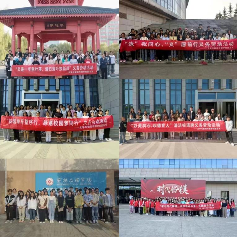 弘扬劳动精神,培育时代新人。文传院相继开展“校园单车整序行,绿意校园梦同行”“以美润心,以德育人”校园标语牌清洁、“‘泳’我同心,‘义’愿前行”游泳馆清扫、“又是一年秋叶落,清扫落叶换新颜”等志愿服务活动。活动的开展不仅美化了校园环境,更是对劳动精神的传承,展现了文传师生积极向上的精神风貌和青春活力。