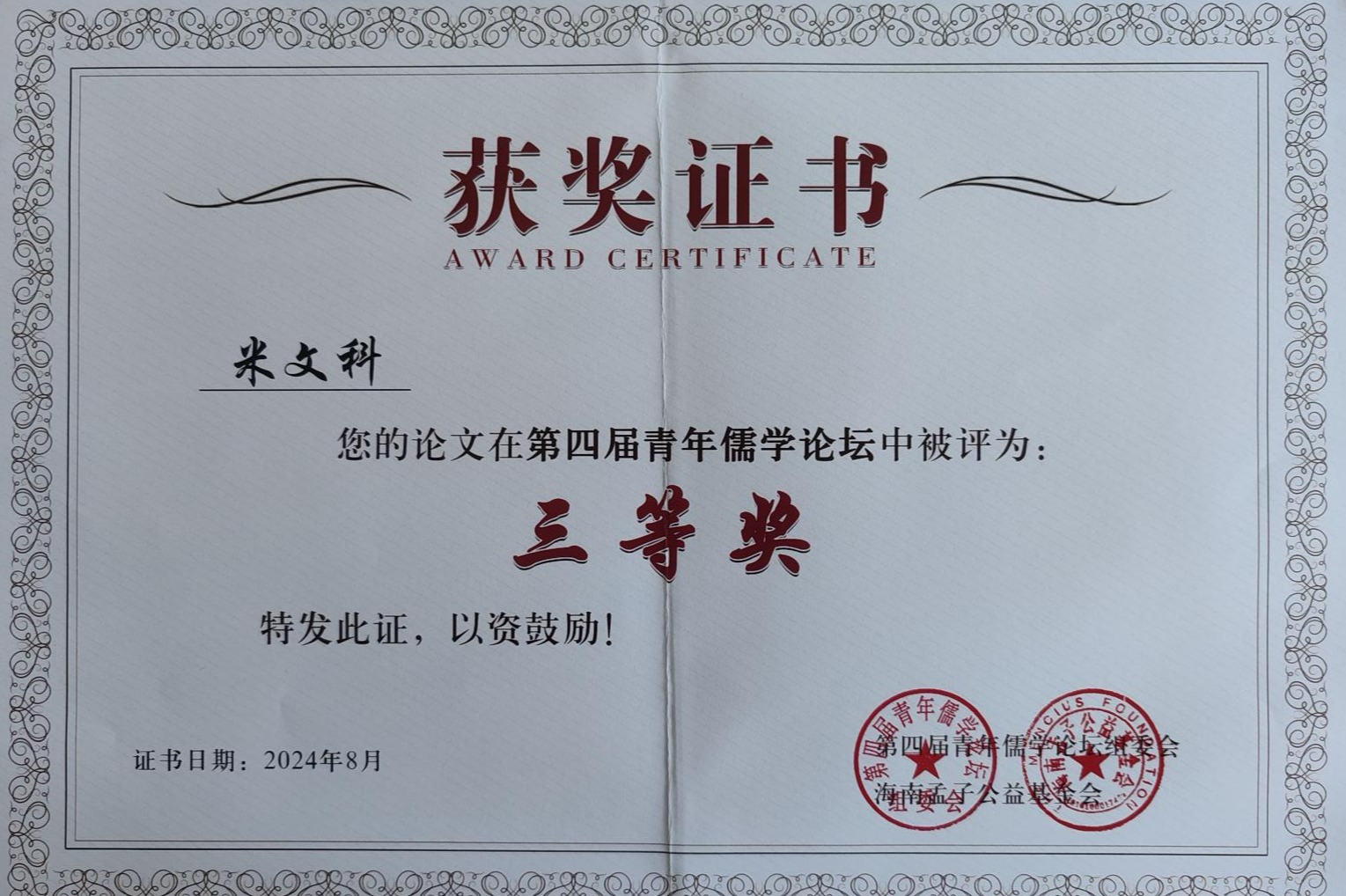 8月13日至14日,由尼山世界儒学中心、中国社会科学院哲学研究所主办,孟子研究院、曲阜文化建设示范区推进办公室承办的“第四届青年儒学论坛”在孟子故里山东省邹城市举办。马克思主义学院米文科教授参加会议并作交流发言,其论文荣获三等奖。