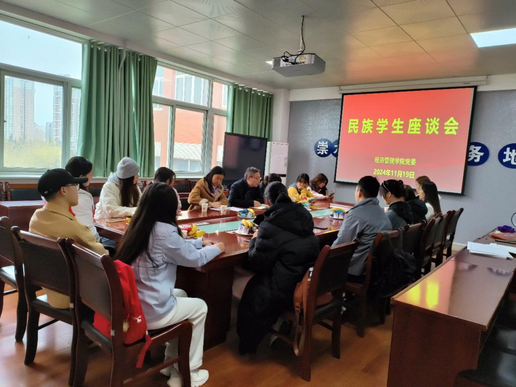 为深入贯彻落实党的二十届三中全会精神,铸牢中华民族共同体意识,11月19日下午,经济管理学院在高新校区思贤楼519会议室召开民族学生座谈会。全体在校民族学生参加会议,会议由学院党委书记邓茹主持。