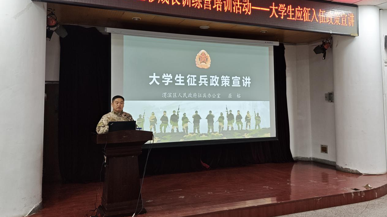 宣讲会上,宝鸡市渭滨区人武部副处职科长屈榕以近期国内国际形势和当前世界热点问题作为切入点,诠释了只有国防事业的发展才能带来社会的安宁稳定和人民的安居乐业。屈榕依据最新政策,详细介绍了高校大学生应征入伍特有的优先考学提拔、补偿学费、退役后享受就学就业优惠等优抚政策,并对同学们关心的事项逐个进行了说明。大学生应征入伍既是国防发展的迫切需要,也是大学生实现人生价值的路径,他希望同学们将入伍作为一个提升自我的桥梁,积极响应国家征兵入伍的号召,到部队中施展才华,为国防事业贡献力量。
