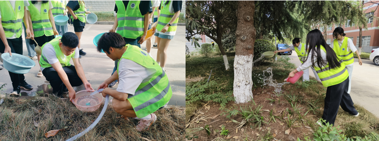 活动现场,党团青年们自带脸盆,往返于最近的水源与绿植区域之间,大家分工协作,形成了一条高效有序的“护绿流水线”。他们或弯腰取水,或细心浇灌,汗水与清水共同浸润着每一寸干涸的土壤。同学们纷纷表示,虽然劳动强度大,但看到树木重焕生机深感自己的付出充满意义。后续学院将在公寓楼周边和学生社区持续性开展浇灌工作,确保每一棵绿植都能在干旱中得到充足养护。
