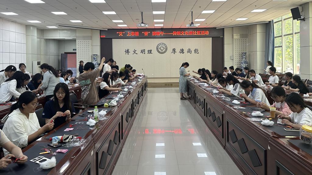 5月29日下午,学工部在高新校区甘棠厅开展“一站式”学生社区“‘艾’上非遗‘香’满端午”主题活动。师生齐聚一堂,亲手缝制艾草香囊,体验西秦刺绣技艺,在传统手作中感受端午文化的独特魅力。