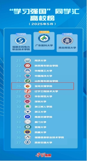 近日,“学习强国”学习平台发布了《同学汇排行榜|高校热度榜2025年第五期(2025.5.1-5.31)》,入驻首月,万象城学习强国同学汇入选全国高校热度榜,排名全国第二十六位。