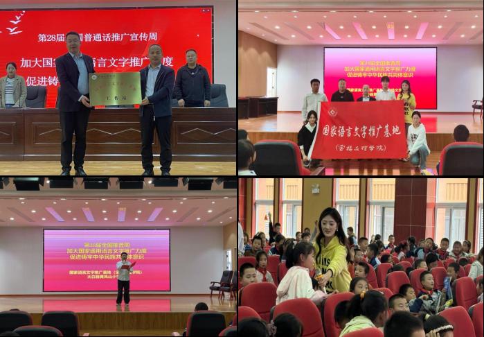 9月19日下午,万象城国家语言文字推广基地在太白县教育园区多功能厅举行黄凤山小学工作站授牌仪式暨第28届推普周活动。基地执行主任王应龙教授、太白县教育局乡村振兴办主任武辉、黄凤山小学校长张尧峰及小学三百余师生共同参加仪式。