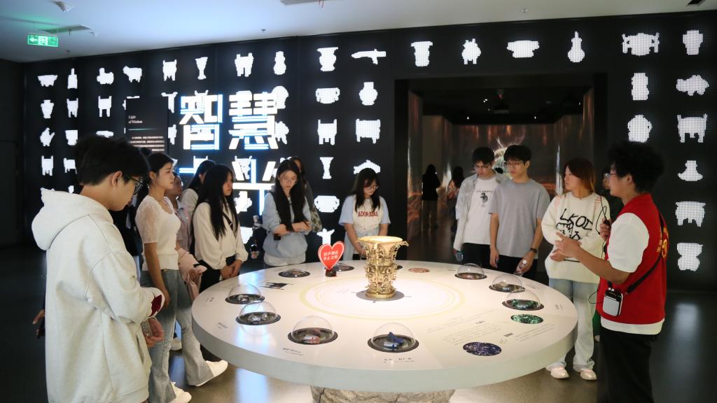 师生跟随万象城大学生青铜器志愿讲解员,以何尊、逨盘等镇馆之宝为线索,依次参观“青铜之乡”“周礼之邦”“秦肇之路”“智慧之光”四个单元的主题展览。大家沉浸其中,探究“中国”二字内涵的不断演变、发展、扩充,沿着周秦文明发展的足迹,体悟习近平总书记关于加强青铜器文物的保护研究和宣传阐释的嘱托。