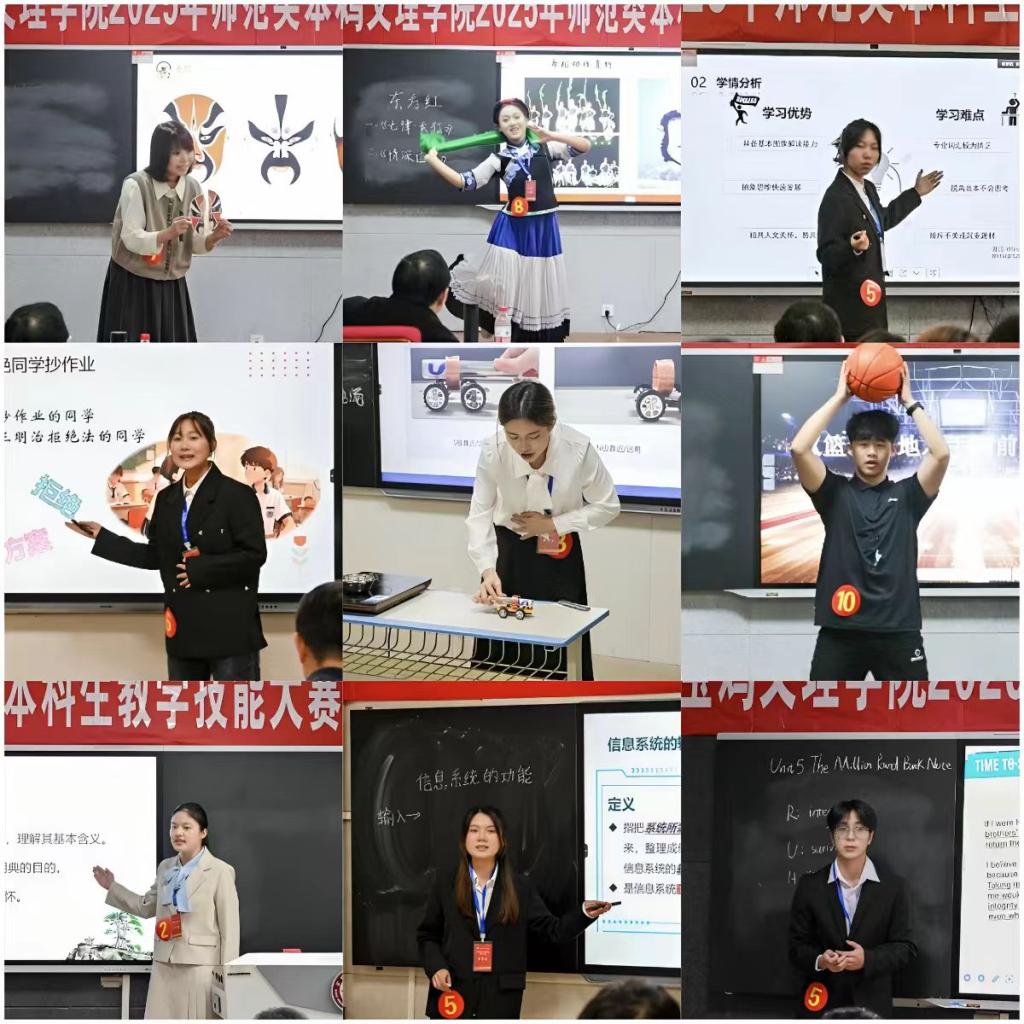 本次大赛由教务处牵头主办、音乐学院承办,以“锤炼教学技能,争做新时代好老师”为核心导向,下设文科组、理科组、综合组三个竞赛组别,精准覆盖不同师范专业培养需求。赛事自启动以来,得到各师范专业学子积极响应,经学院初赛、校级复赛层层选拔,最终来自全校16个师范专业的39名优秀本科生脱颖而出,站上决赛舞台。