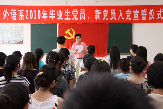 为纪念中国共产党成立89周年,6月29日下午,外语系党总支举行毕业生党员、新党员入党宣誓活动。院党委组织部部长郑存库,外语系党总支书记冯森、副书记孙勇敏,学生辅导员以及103名预备党员、33名学生正式党员庄严地在党旗面前进行了宣誓。宣誓活动由孙勇敏主持。