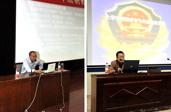 按照学校《关于开展法制教育第一课活动的通知》精神,党委宣传部于9月12日和16日邀请政法系吕晓伟副教授、赵林虎讲师分别在新校区木铎厅、老校区2号学术报告厅为大学生作了法制教育报告。