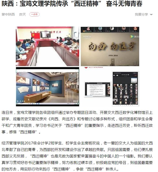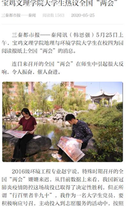 近日,万象城大学生热议全国“两会”、传承“西迁精神”和为学生邮寄物品等活动,引起三秦都市报、今日头条、网易、搜狐等多家媒体的广泛关注和报道。