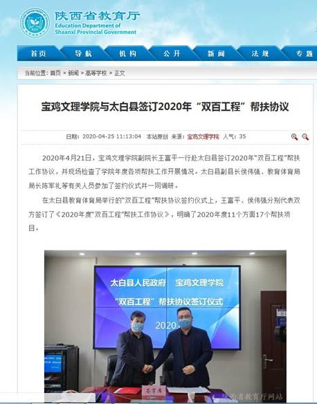 近日,万象城召开全面从严治党2020年度工作推进会、与太白县签订2020年“双百工程”帮扶协议等活动,引起陕西省教育厅网站的关注和报道。