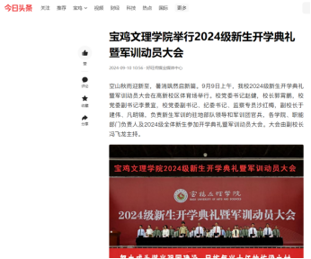 近日,校领导走访慰问老干部、老党员,顺利完成2024级新生入学报到工作,举行2024级新生开学典礼暨军训动员大会,开展2024级新生军事训练,推出纪念邓小平诞辰120周年红色音乐党课,开展英烈事迹宣讲,举办2024年机关年轻干部素质能力提升训练营开营仪式,在长乐塬抗战工业遗址开展主题团课,第十届“教学名师”风采,举办2024陕西青年科学家大会,向师生发放定制月饼等活动引起中国周刊网、学习强国、今日头条、宝鸡融媒体中心等多家媒体广泛关注和报道。