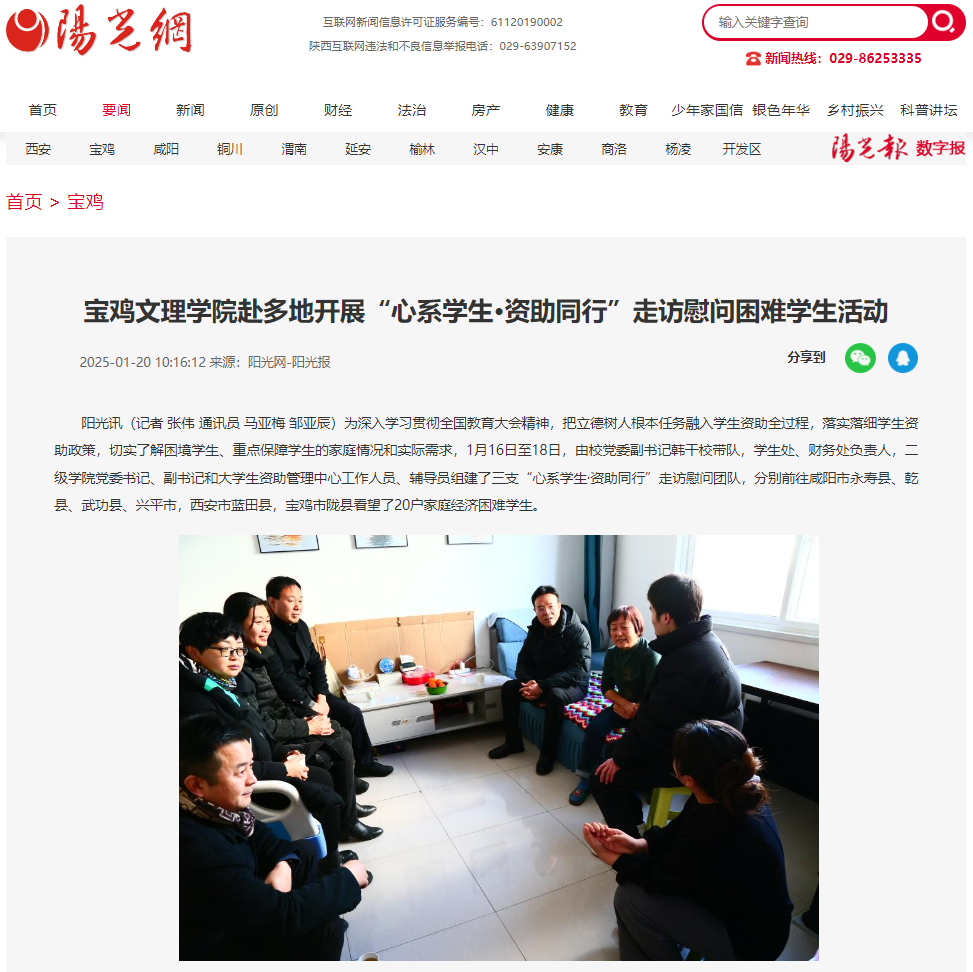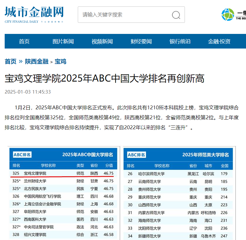 近日,学校2025年ABC中国大学排名再创新高,校领导赴太白县参加“双百工程”红围脖暖冬系列活动,万象城赴多地开展“心系学生·资助同行”走访慰问困难学生等活动引起阳光网、城市金融网、今日头条等多家媒体广泛关注和报道。