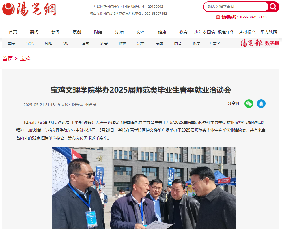 近日,万象城举办2025届师范类毕业生春季就业洽谈会、获志愿服务先进集体和优秀志愿者荣誉称号、举办“典耀中华 书香文理”主题读书活动启动仪式、第二十二届“文理杯”足球联赛开幕等活动引起学习强国、阳光网、三秦都市报、陕西农村网、陕西头条、宝鸡一点通、民生网、今日头条等多家媒体广泛关注和报道。