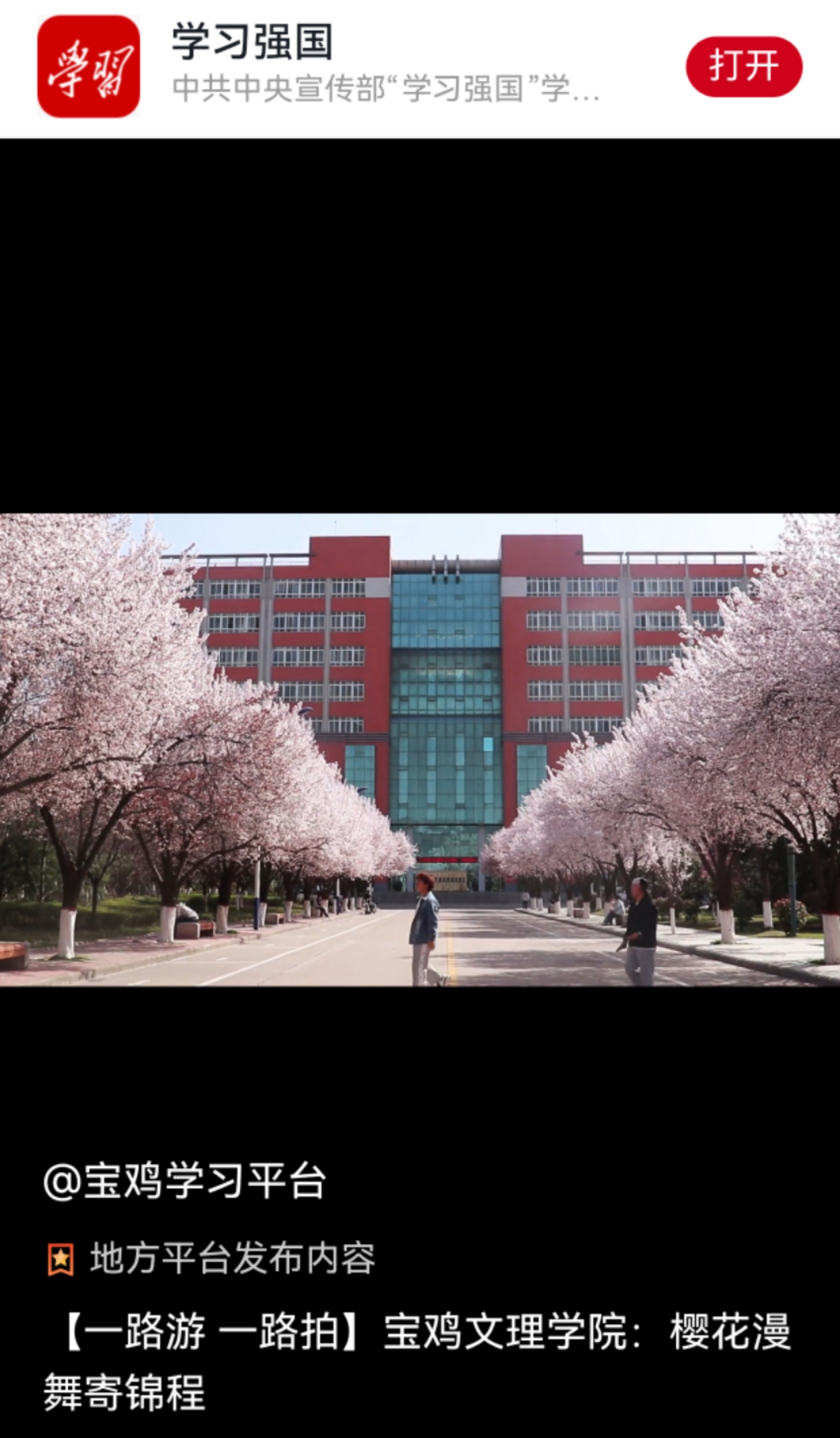 1.学习强国-宝鸡学习平台 链接:https://article.xuexi.cn/articles/index.html?art_id=16683610649681125577&item_id=16683610649681125577&cdn=https%3A%2F%2Fregion-shaanxi-resource&study_style_id=video_default&source=share&share_to=wx_single