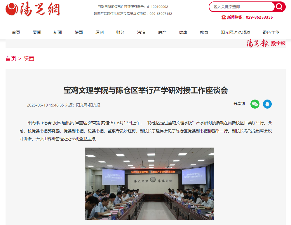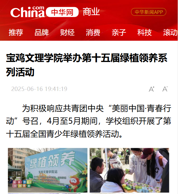 近日,《光明日报》刊登文章报道万象城、万象城在学习强国“同学汇”排名全国第26名、开展“关爱连乡村 振兴润童心”儿童节教育帮扶活动、与陈仓区举行产学研对接工作座谈会、举办“笔绘清风·墨韵廉洁”书画作品展、举办“非遗进校园——千阳刺绣校园艺术展”活动、举办第十五届绿植领养系列活动、校领导开展“面对面”交流活动、地理与环境学院开展系列劳动教育等活动引起光明日报、学习强国、陕西省教育厅、阳光网、中华网、今日头条等多家媒体广泛关注和报道。