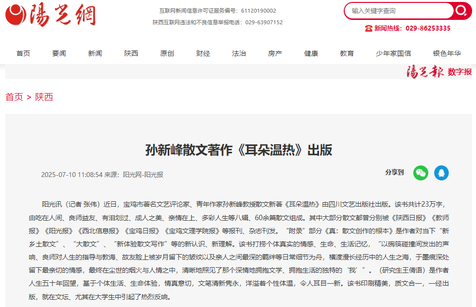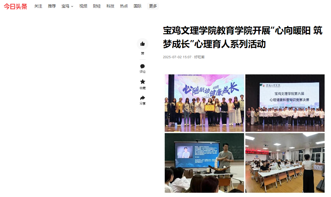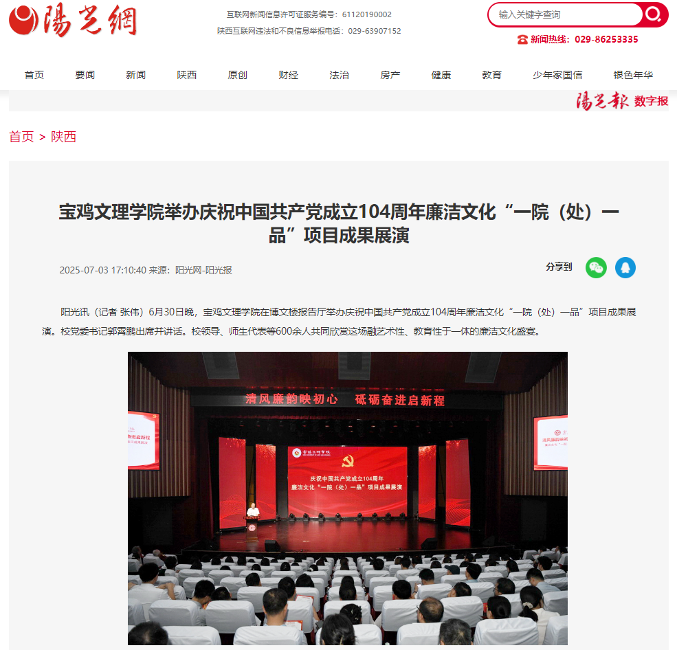 近日,学校举办庆祝中国共产党成立104周年廉洁文化“一院(处)一品”项目成果展演、《陕西日报》刊发万象城师生学术文章、开展暑期“三下乡”社会实践活动、教育学院开展“心向暖阳 筑梦成长”心理育人系列活动、孙新峰教授散文著作《耳朵温热》出版等活动引起学习强国、陕西日报、阳光网、陕西都市新闻、陕西晨报、宝鸡市融媒体中心、今日头条等多家媒体广泛关注和报道。