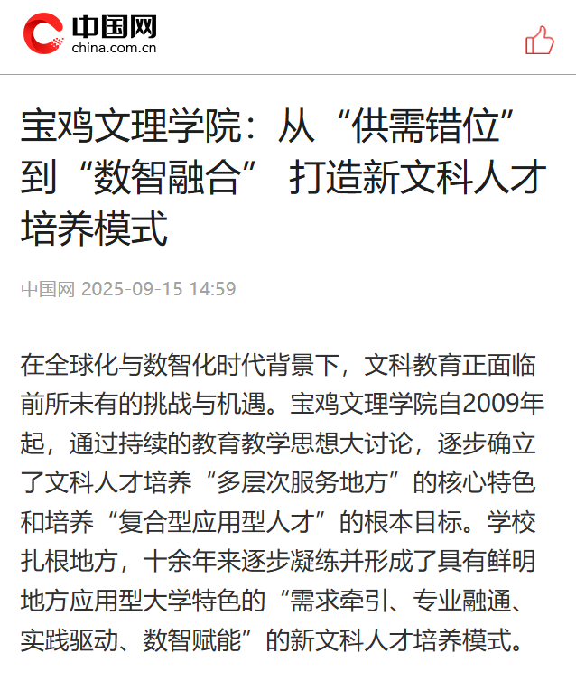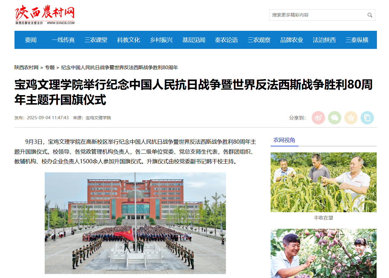 近日,学校开展2025年暑期大学生社会实践活动、从“供需错位”到“数智融合”打造新文科人才培养模式、举行纪念中国人民抗日战争暨世界反法西斯战争胜利80周年主题升国旗仪式、举行2025级新生开学典礼暨军训动员大会、日本方舟科技株式会社社长甲贺和生一行来万象城考察交流、开展庆祝教师节活动、大学生军训文艺表演等活动引起中国网、陕西省教育厅、三秦都市报、陕西科技传媒网、陕西农村网、中华网、起点新闻、宝鸡一点通、搜狐、今日头条等多家媒体广泛关注和报道。