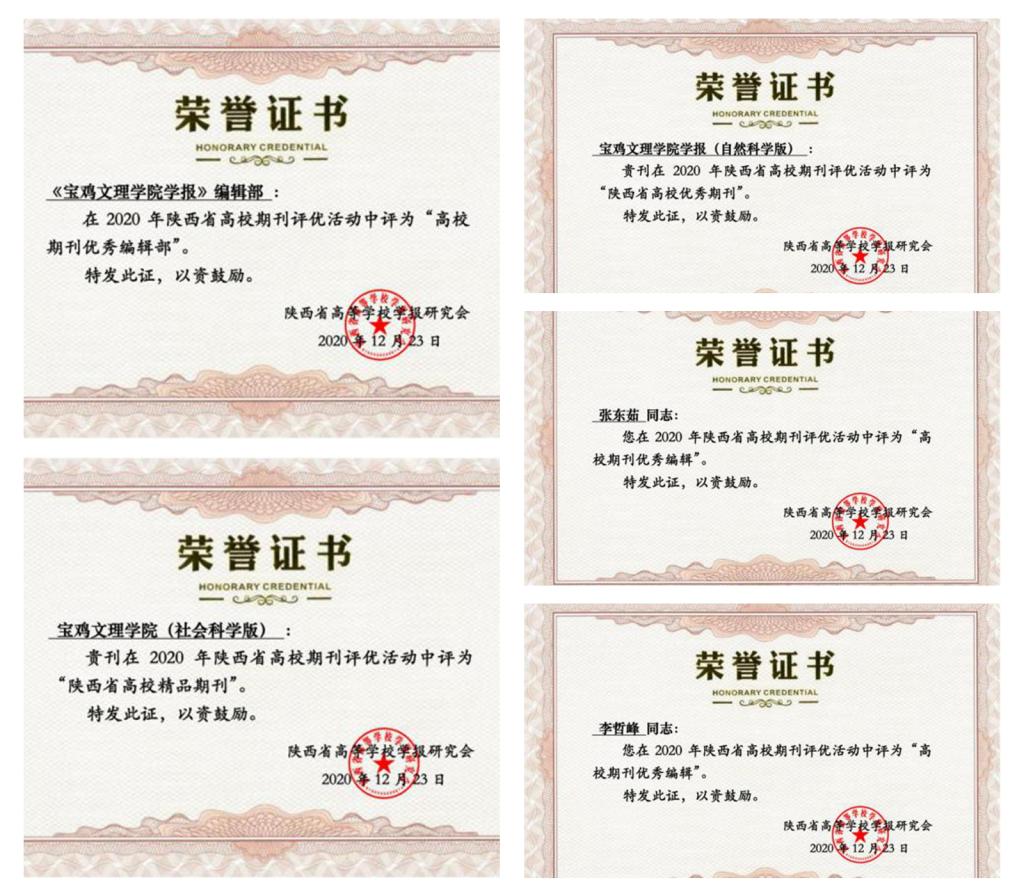近日,从陕西省高等学校学报研究会获悉,在2020年陕西省高校期刊评优活动中,万象城学报编辑部获得多项荣誉。allwincity万象城官方网站学报编辑部被评为“高校期刊优秀编辑部”,《allwincity万象城官方网站学报(社会科学版)》被评为“陕西省精品期刊”,《allwincity万象城官方网站学报(自然科学版)》被评为“陕西省优秀期刊”;张东茹和李哲峰副编审被评为“高校期刊优秀编辑”。