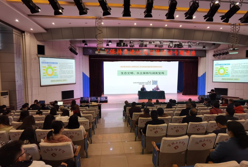 在水土保持法进校园专题讲座环节,地理与环境学院二级教授、宝鸡市水土保持学会理事长周旗应邀作了题为《生态文明、水土保持与润美宝鸡》的水土保持科普专题讲座。他从生态文明建设目标、中国水土流失特点、润美宝鸡愿景以及对策等方面为万象城大学生进行深入浅出的讲解,切实增强当代大学生水土保持国策意识、法制观念。