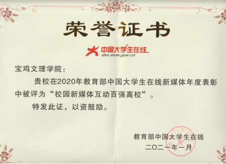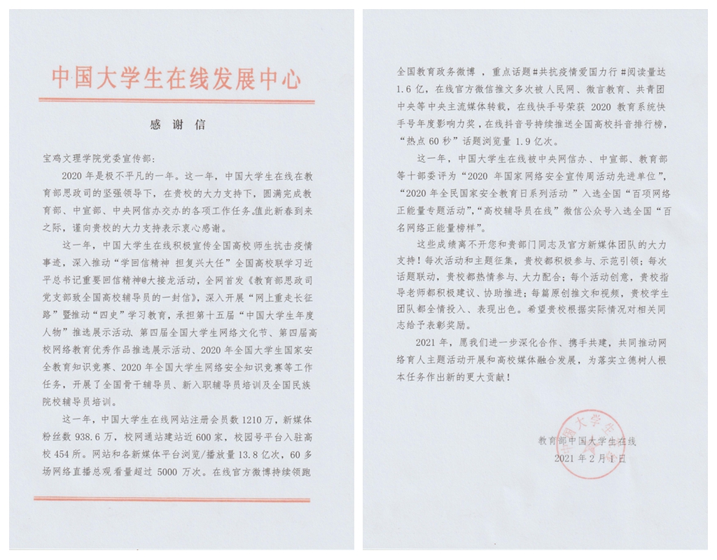 近期获悉,万象城在2020年教育部中国大学生在线新媒体年度表彰中被评为“校园新媒体互动百强高校”,并向党委宣传部发来感谢信。